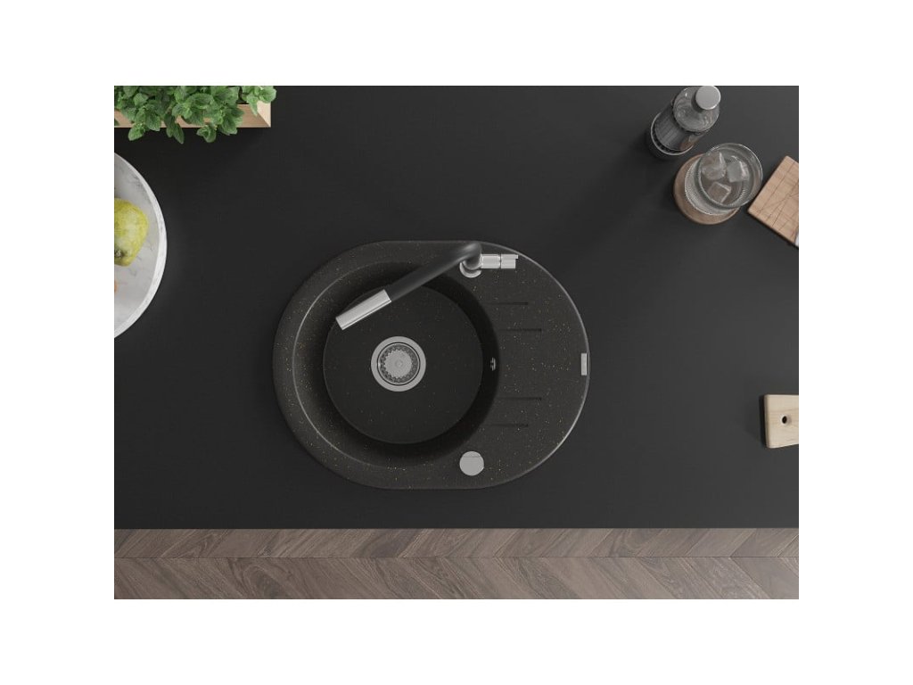 Granitový drez Mexen Kevin s 1 misou, odkapávačom a kuchynskou batériou Flora, čierna/zlatá metalíza - 6517-75-670401-07