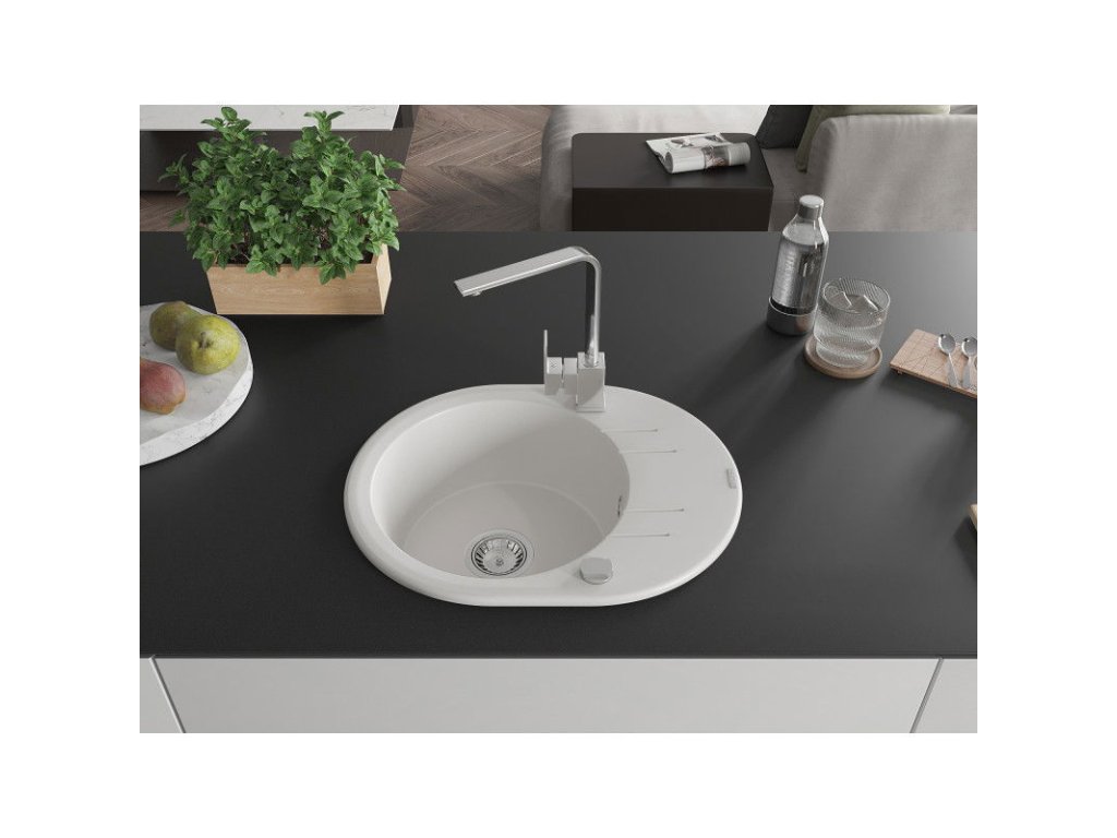 Granitový drez Mexen Kevin s 1 misou, odkapávačom a kuchynskou batériou Rita, biely - 6517-20-670300-00