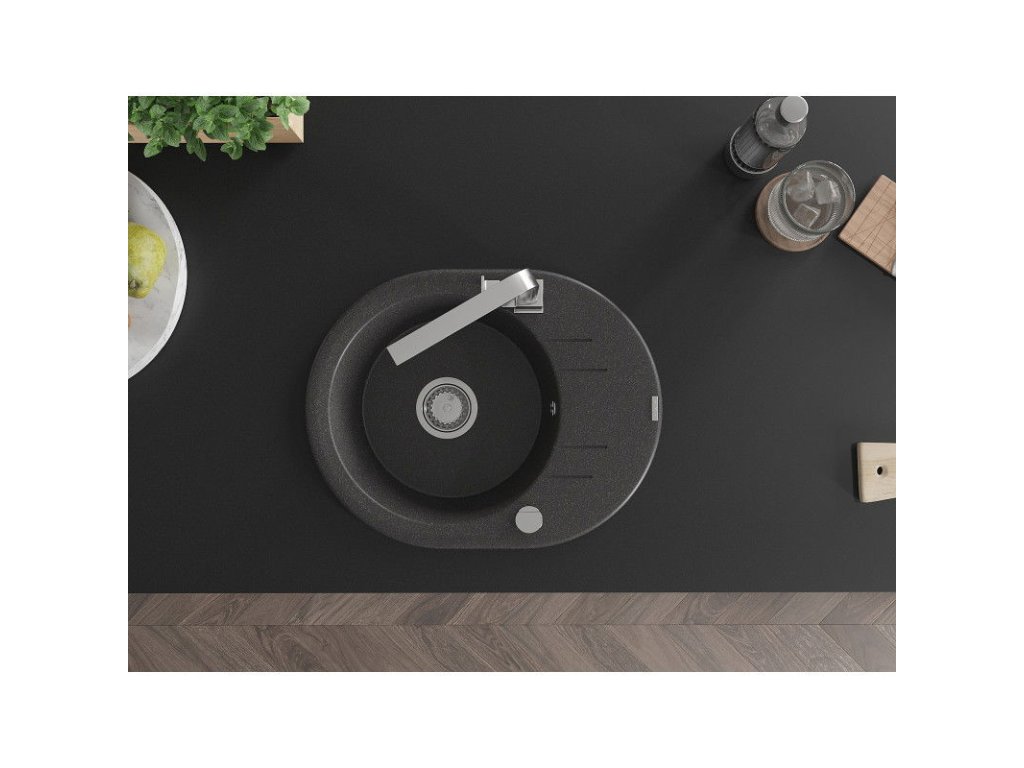 Granitový drez Mexen Kevin s 1 misou, odkapávačom a kuchynskou batériou Rita, čierna škvrna - 6517-76-670300-00