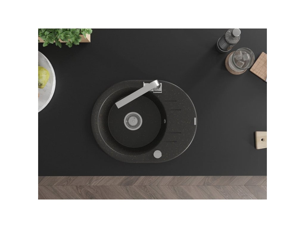 Granitový drez Mexen Kevin s 1 misou, odkapávačom a kuchynskou batériou Rita, čierna/zlatá metalíza - 6517-75-670300-00