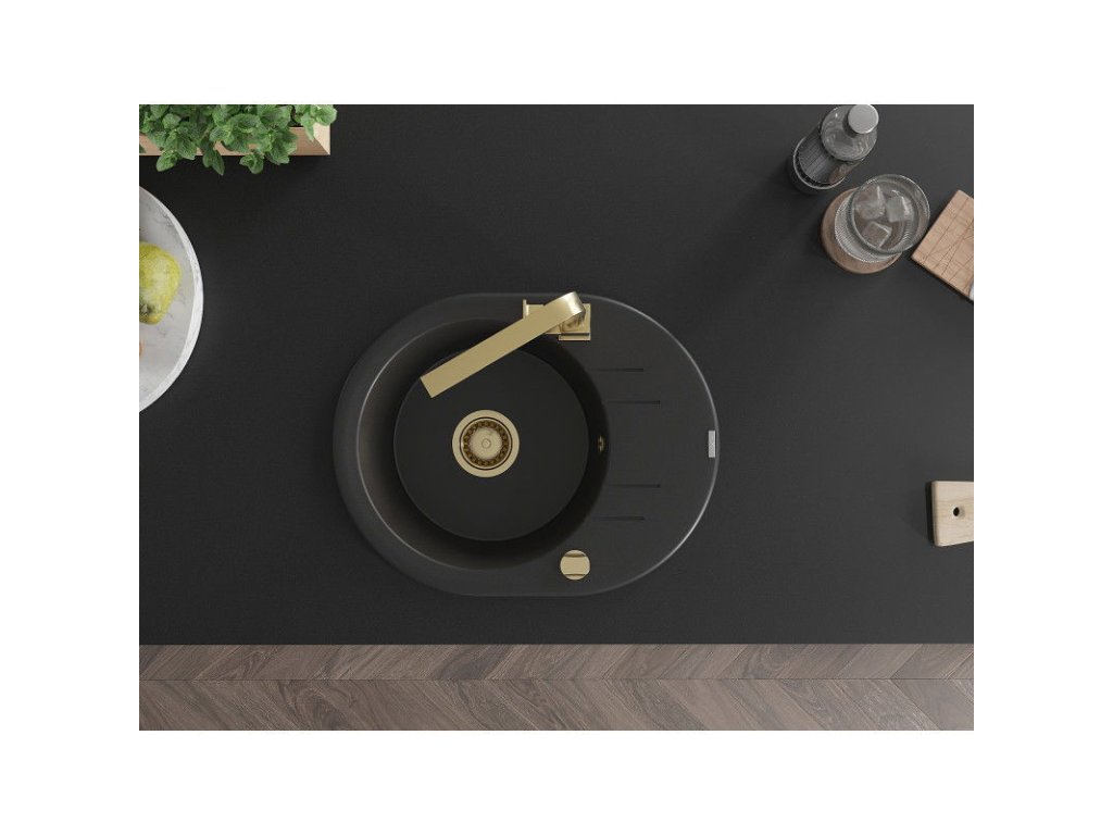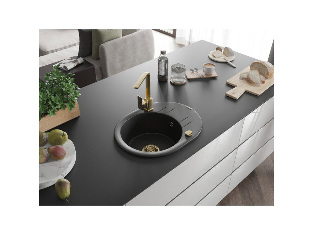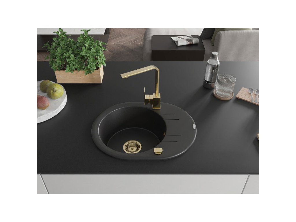 Granitový drez Mexen Kevin s 1 misou, odkapávačom a kuchynskou batériou Rita, čierny - 6517-77-670300-50