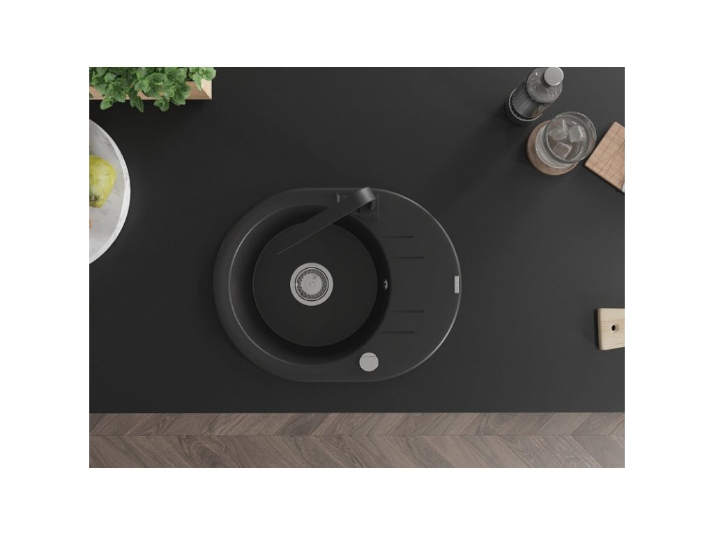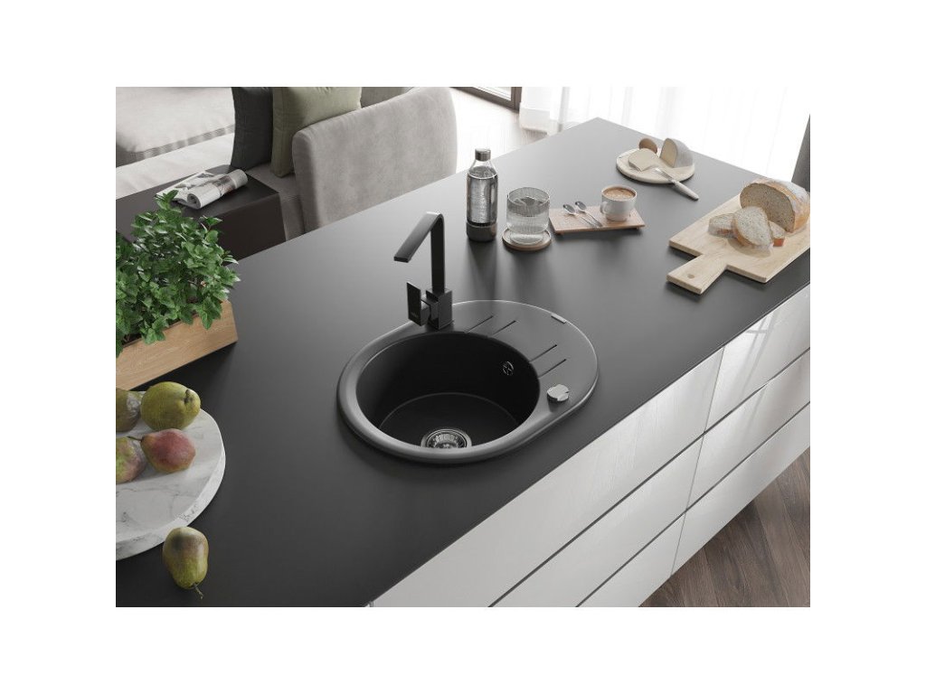 Granitový drez Mexen Kevin s 1 misou, odkapávačom a kuchynskou batériou Rita, čierny - 6517-77-670300-70