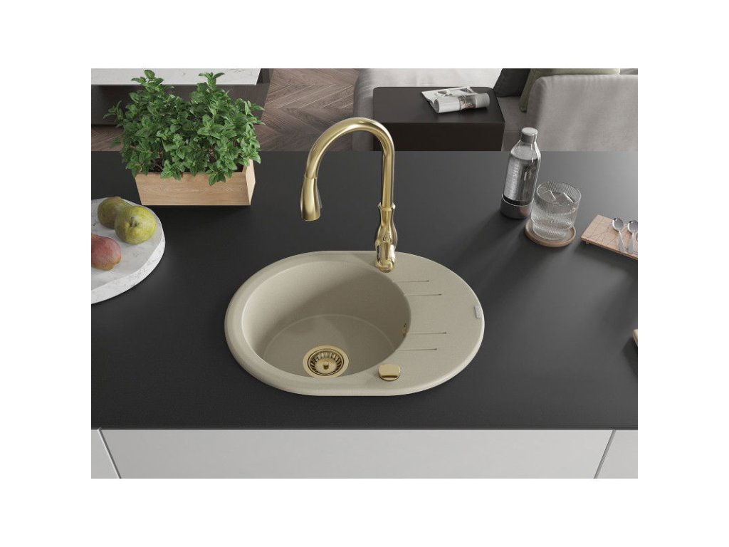 Granitový drez Mexen Kevin s 1 misou, odkapávačom a kuchynskou batériou Savita, béžový - 6517-69-672601-50