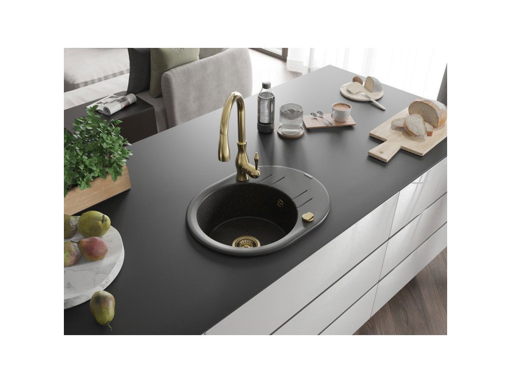 Granitový drez Mexen Kevin s 1 misou, odkapávačom a kuchynskou batériou Savita, čierna/zlatá metalíza - 6517-75-672601-50
