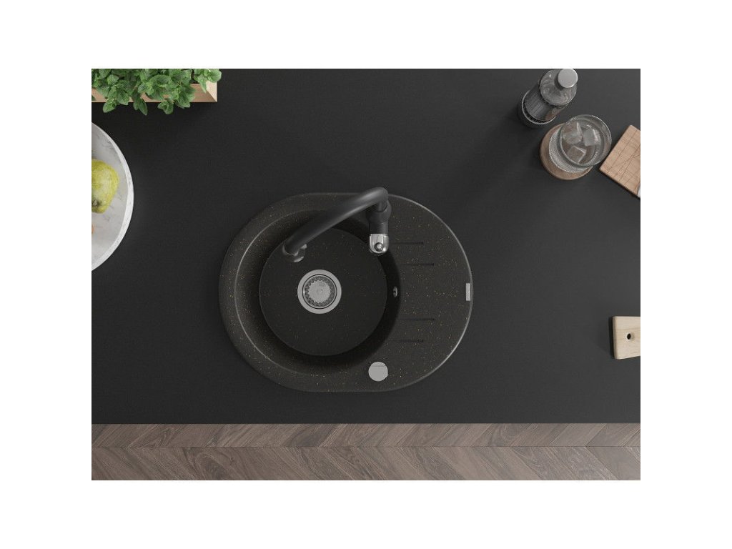 Granitový drez Mexen Kevin s 1 misou, odkapávačom a kuchynskou batériou Savita, čierna/zlatá metalíza - 6517-75-672601-70