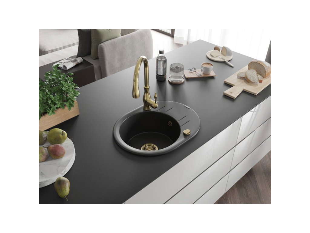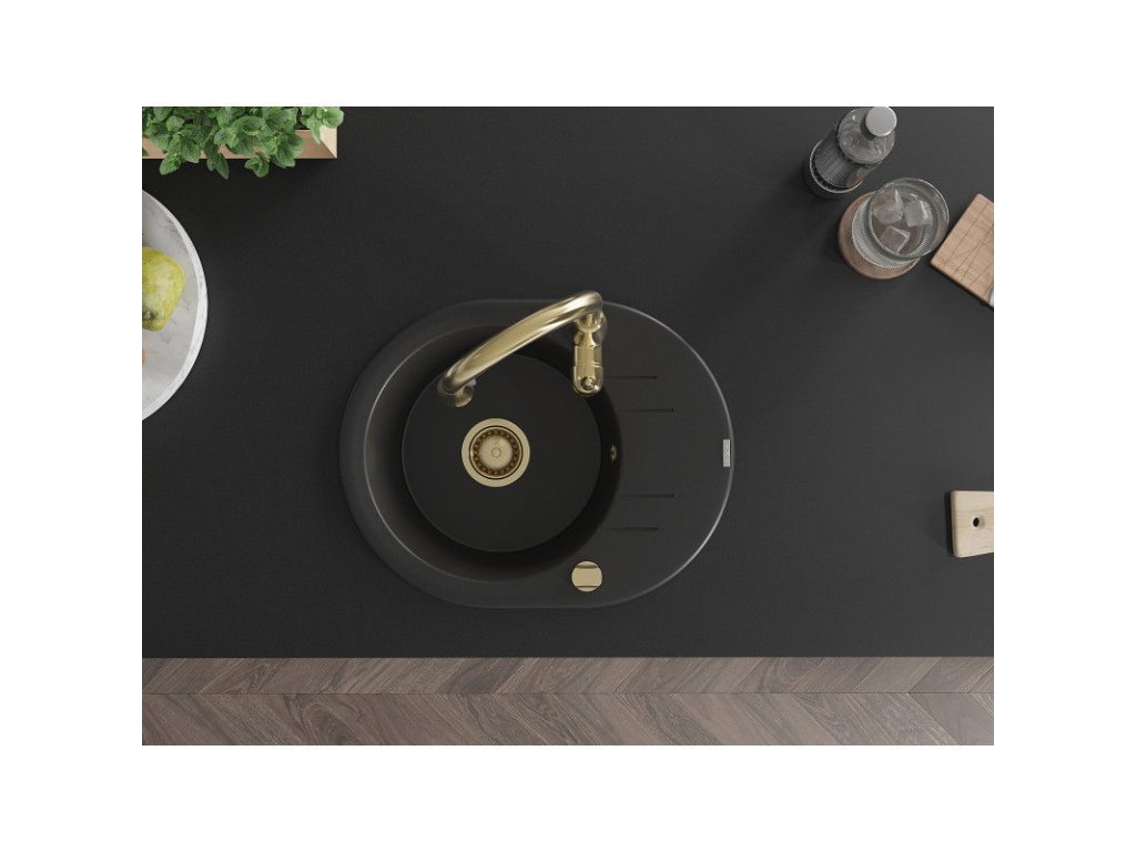 Granitový drez Mexen Kevin s 1 misou, odkapávačom a kuchynskou batériou Savita, čierny - 6517-77-672601-50