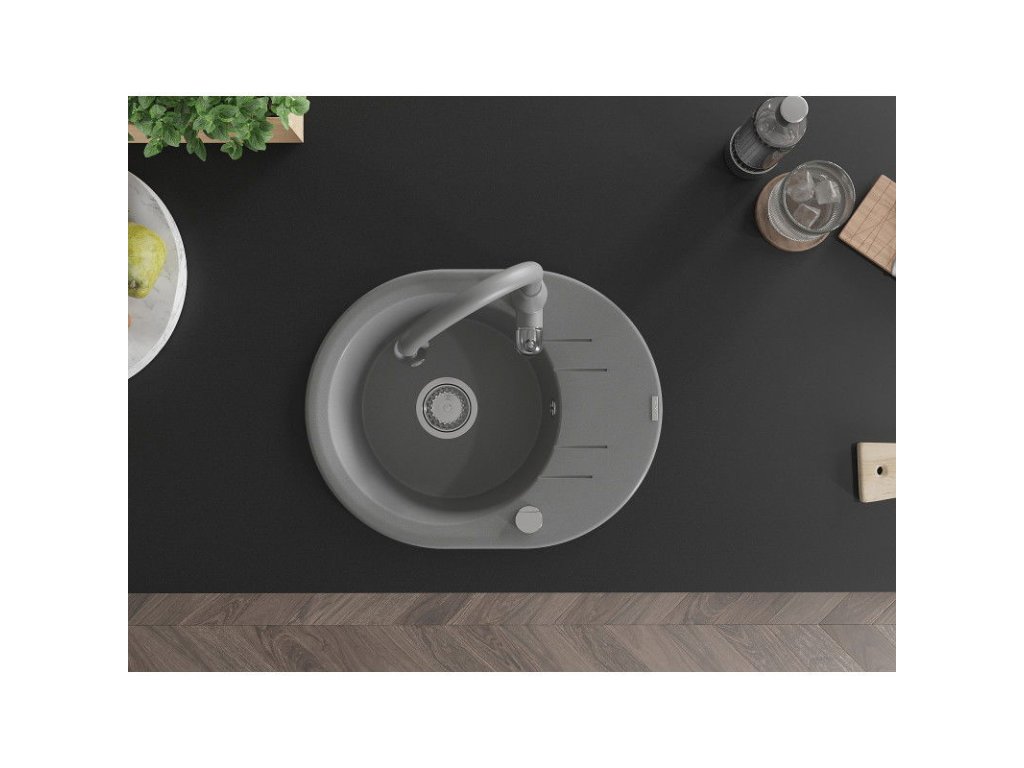 Granitový drez Mexen Kevin s 1 misou, odkapávačom a kuchynskou batériou Savita, sivý - 6517-71-672601-71