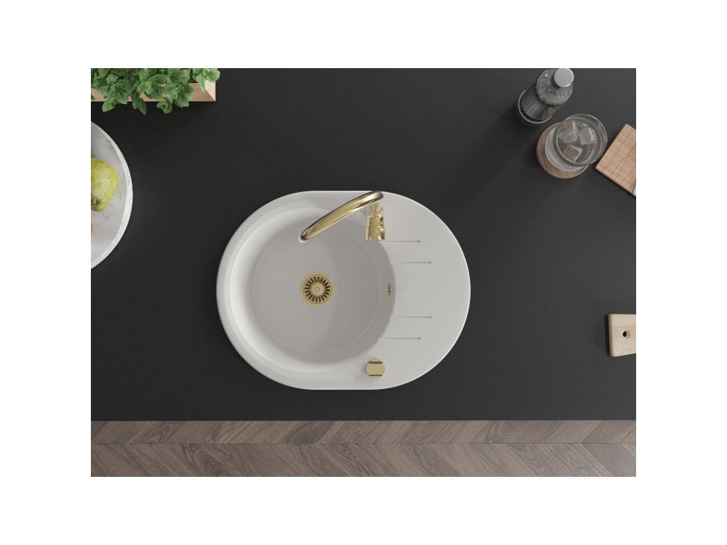 Granitový drez Mexen Kevin s 1 misou, odkapávačom a kuchynskou batériou Telma, biely - 6517-20-670200-50