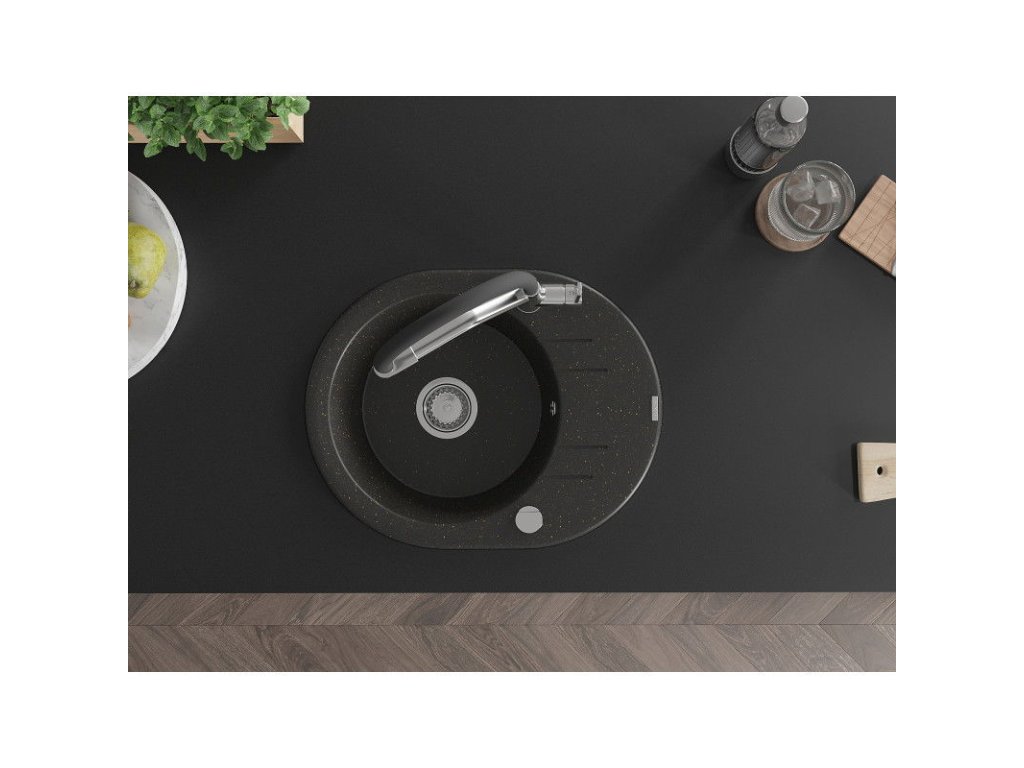 Granitový drez Mexen Kevin s 1 misou a kuchynskou batériou Duo, čierna/zlatá metalíza - 6517-75-671701-07