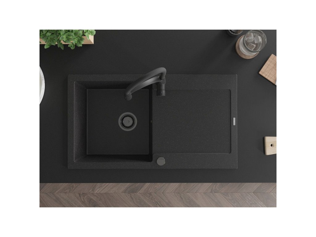 Granitový drez Mexen Leo s 1 misou, odkapávačom a batériou Aster, čierna/strieborná metalíza - 6501-73-73450-70-B