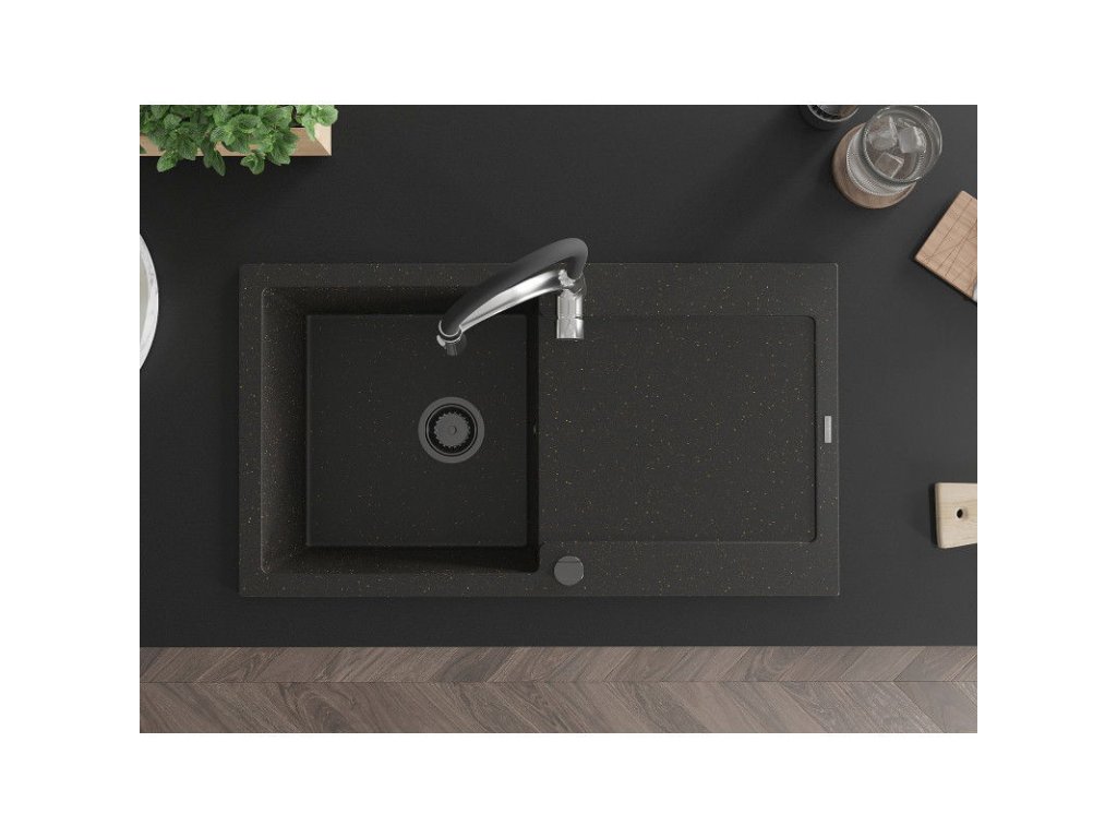 Granitový drez Mexen Leo s 1 misou, odkapávačom a batériou Aster, čierna/zlatá metalíza - 6501-75-73450-07-B