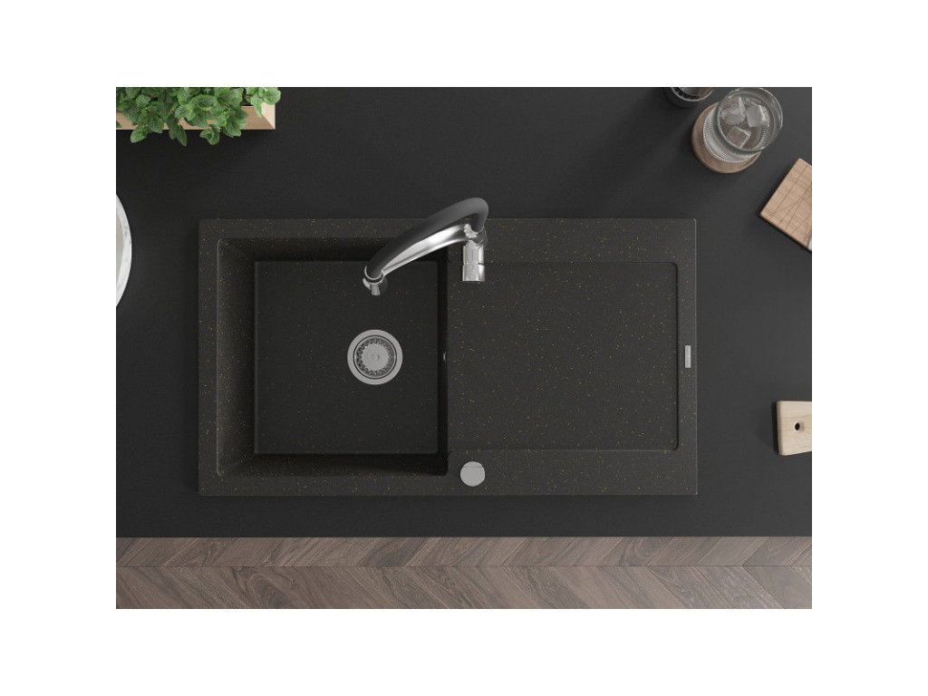 Granitový drez Mexen Leo s 1 misou, odkapávačom a batériou Aster, čierna/zlatá metalíza - 6501-75-73450-07