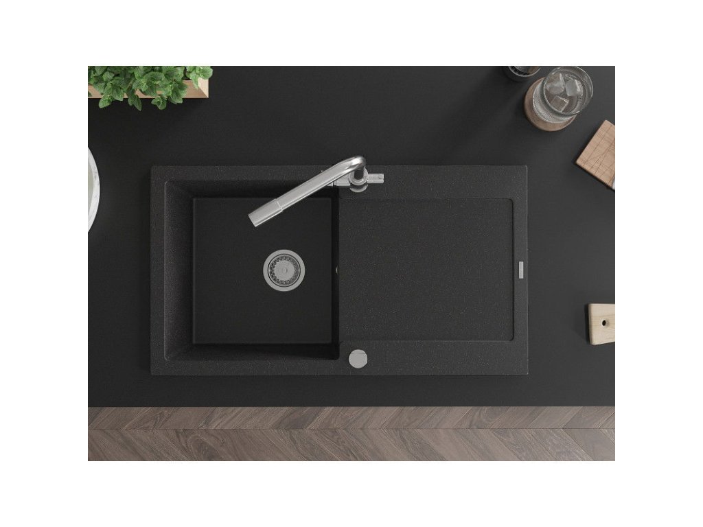 Granitový drez Mexen Leo s 1 misou, odkapávačom a batériou Duero, čierna/strieborná metalíza - 6501-73-671600-00