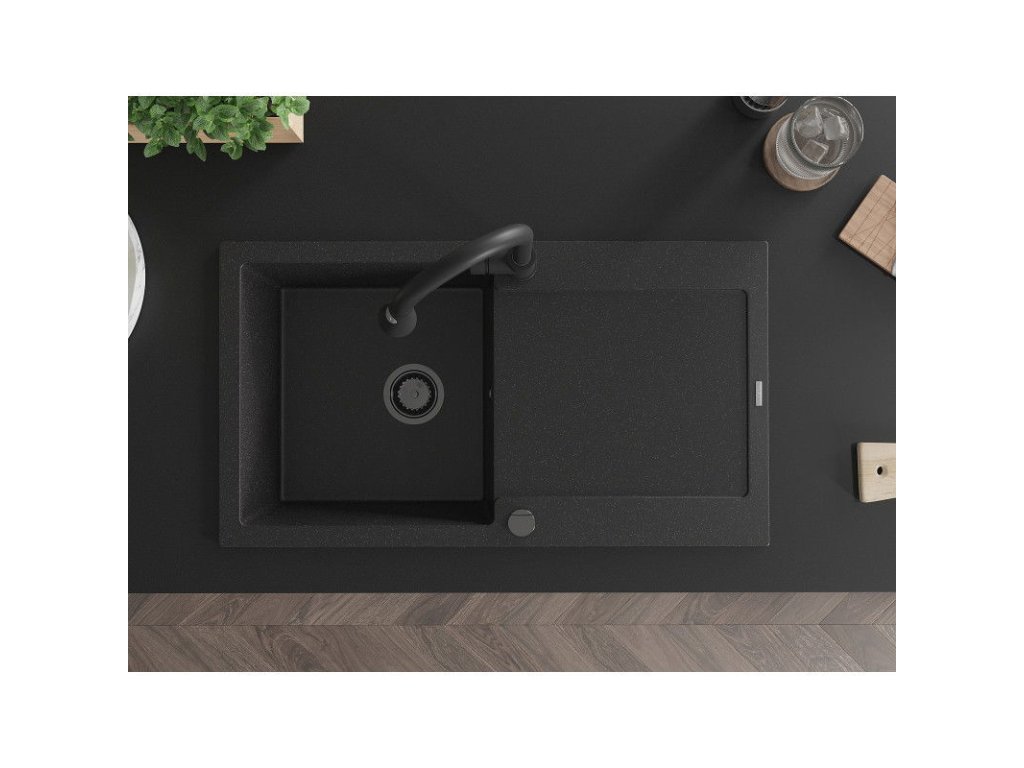 Granitový drez Mexen Leo s 1 misou, odkapávačom a batériou Elia, čierna/strieborná metalíza - 6501-73-670101-70-B