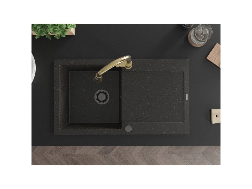 Granitový drez Mexen Leo s 1 misou, odkapávačom a batériou Elia, čierna/zlatá metalíza - 6501-75-670101-50-B