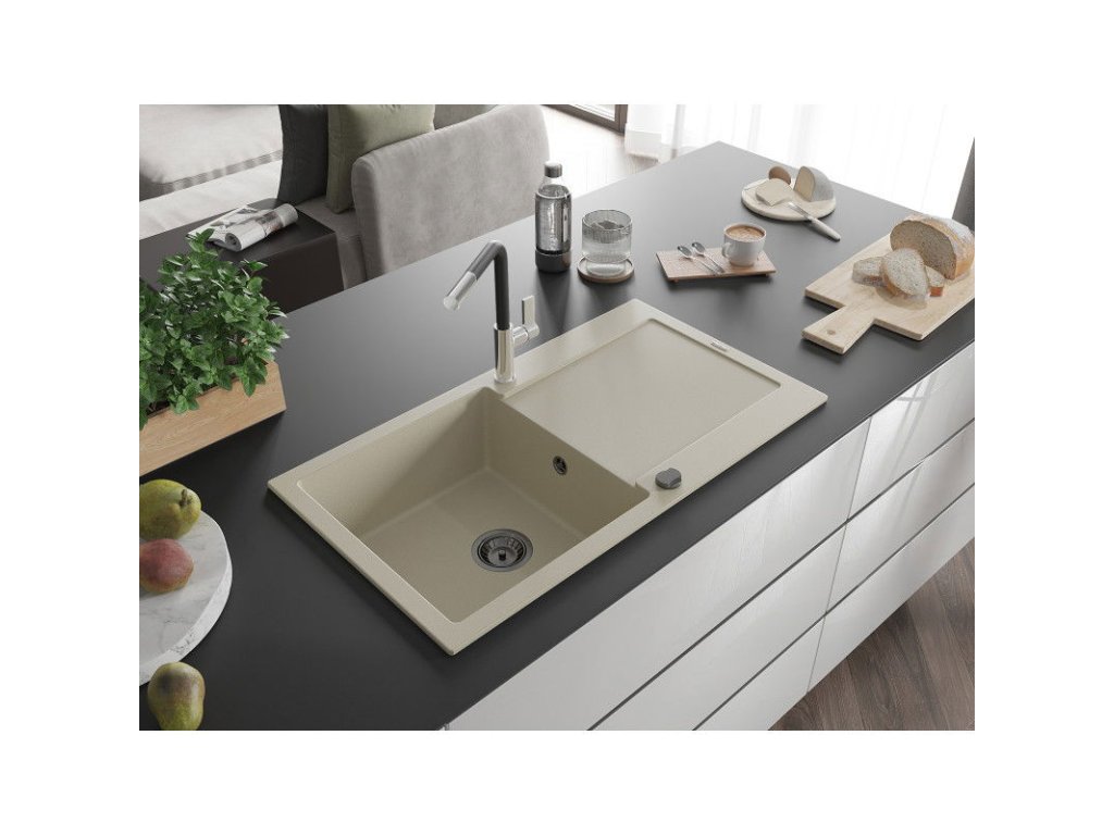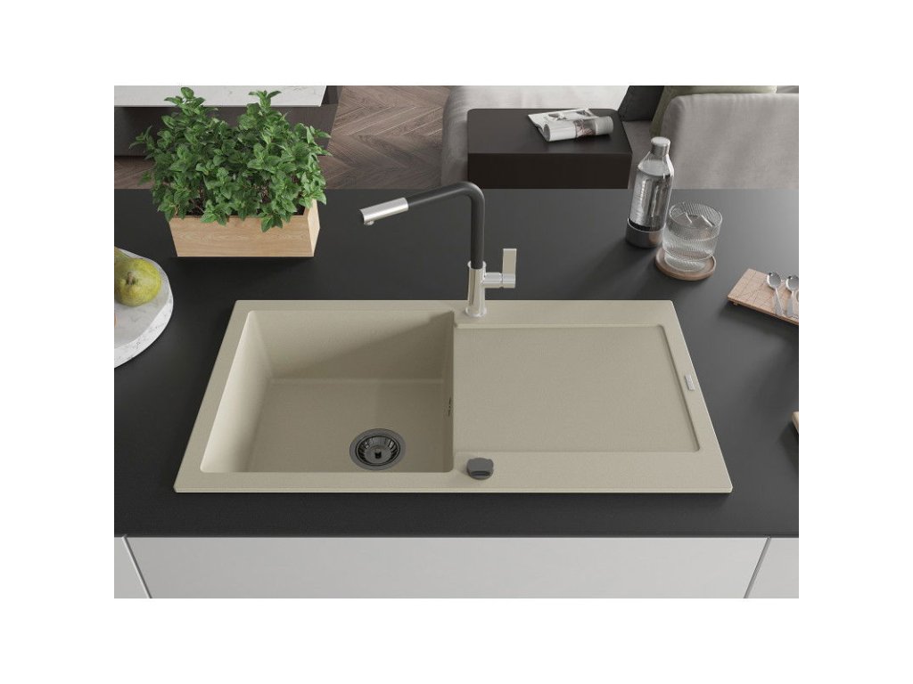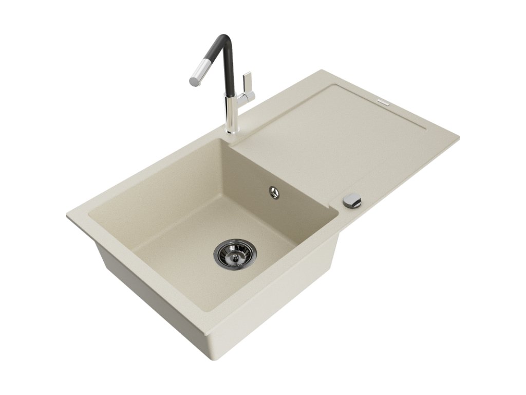 Granitový drez Mexen Leo s 1 misou, odkapávačom a batériou Flora, béžový - 6501-69-670401-07-B
