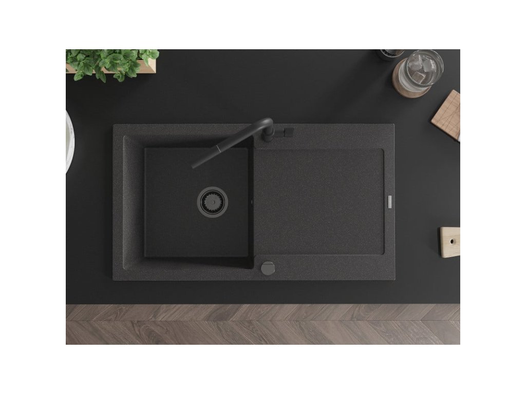 Granitový drez Mexen Leo s 1 misou, odkapávačom a batériou Flora, čierna škvrnitá - 6501-76-670401-70-B