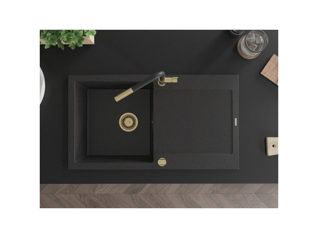 Granitový drez Mexen Leo s 1 misou, odkapávačom a batériou Flora, čierna/strieborná metalíza - 6501-73-670401-57-G