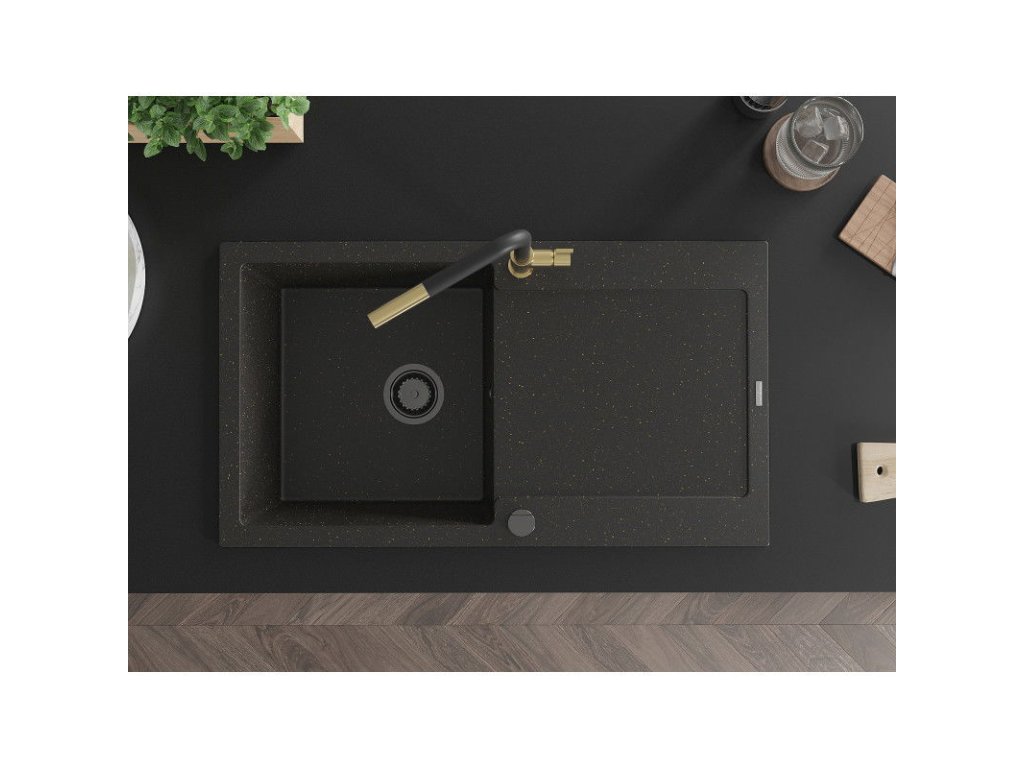 Granitový drez Mexen Leo s 1 misou, odkapávačom a batériou Flora, čierna/zlatá metalíza - 6501-75-670401-57-B