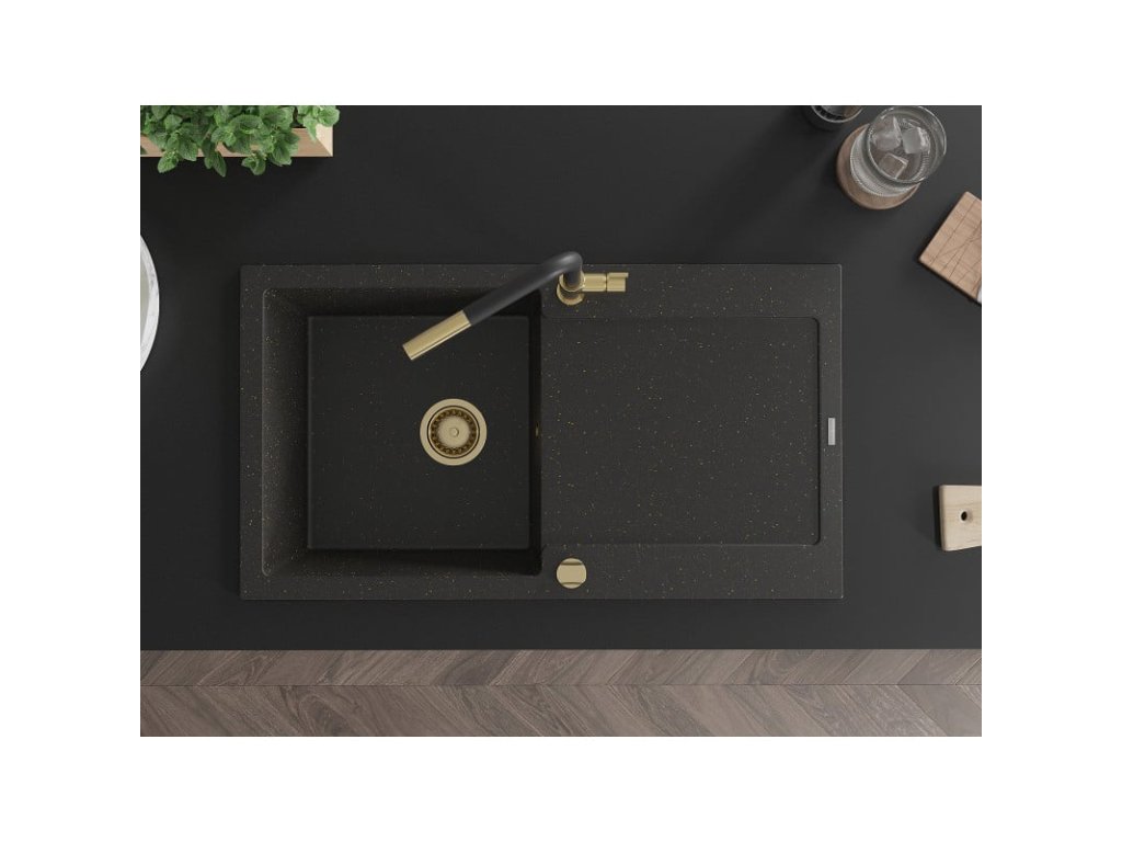 Granitový drez Mexen Leo s 1 misou, odkapávačom a batériou Flora, čierna/zlatá metalíza - 6501-75-670401-57-G