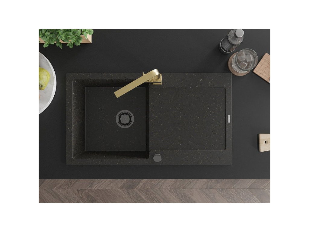 Granitový drez Mexen Leo s 1 misou, odkapávačom a batériou Rita, čierna/zlatá metalíza - 6501-75-670300-50-B