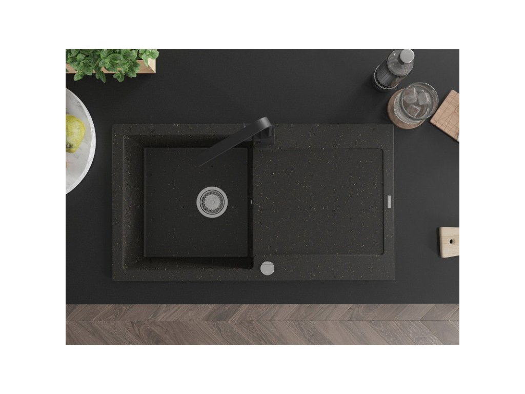 Granitový drez Mexen Leo s 1 misou, odkapávačom a batériou Rita, čierna/zlatá metalíza - 6501-75-670300-70