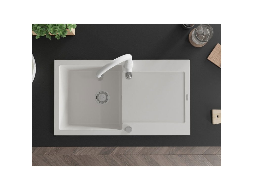 Granitový drez Mexen Leo s 1 misou, odkapávačom a batériou Savita, biely - 6501-20-672601-20