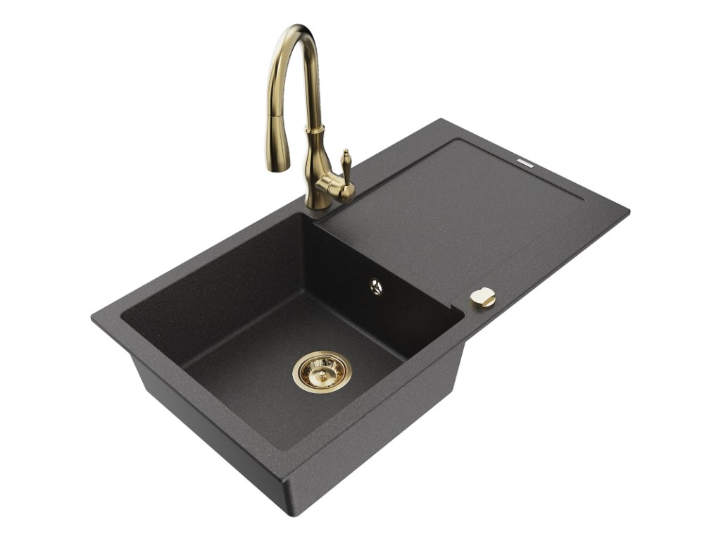 Granitový drez Mexen Leo s 1 misou, odkapávačom a batériou Savita, čierna škvrnitá - 6501-76-672601-50