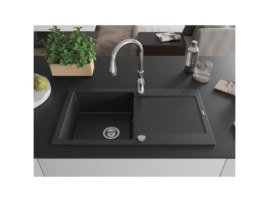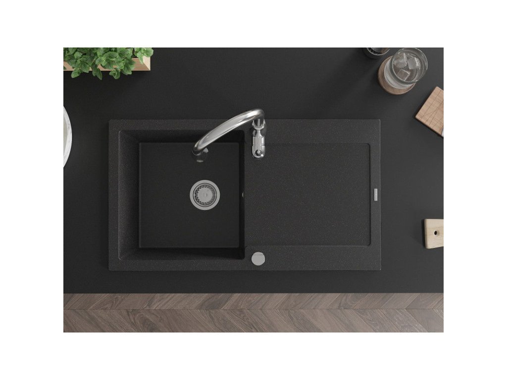 Granitový drez Mexen Leo s 1 misou, odkapávačom a batériou Savita, čierna/strieborná metalíza - 6501-73-672601-00