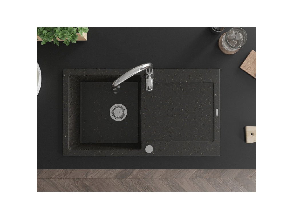 Granitový drez Mexen Leo s 1 misou, odkapávačom a batériou Savita, čierna/zlatá metalíza - 6501-75-672601-00