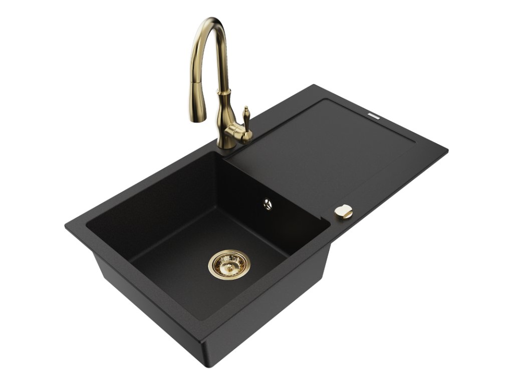 Granitový drez Mexen Leo s 1 misou, odkapávačom a batériou Savita, čierny - 6501-77-672601-50