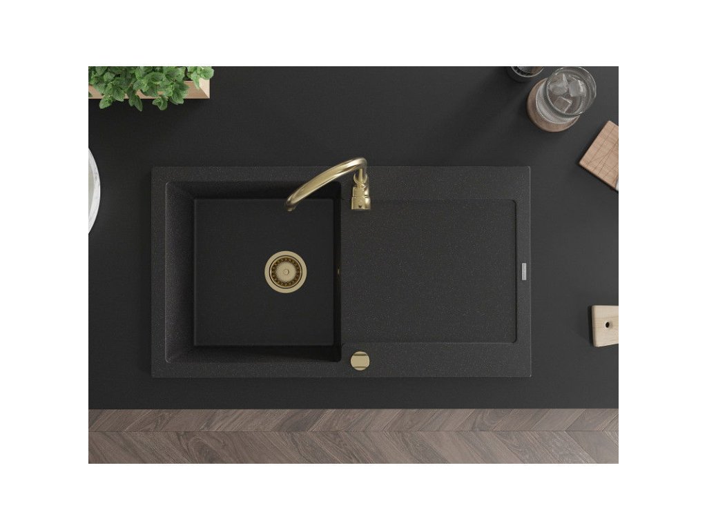 Granitový drez Mexen Leo s 1 misou, odkapávačom a batériou Telma, čierna/strieborná metalíza - 6501-73-670200-50