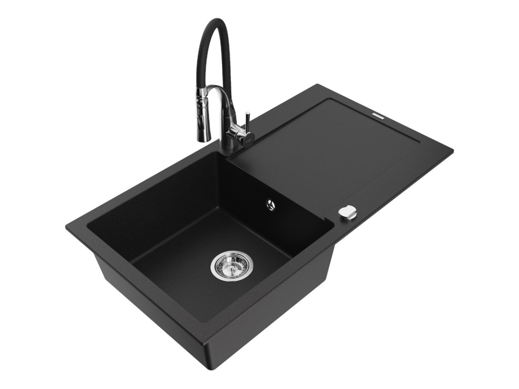 Granitový drez Mexen Leo s 1 misou, odkapávačom a kuchynskou batériou Aster, čierny - 6501-77-73450-07