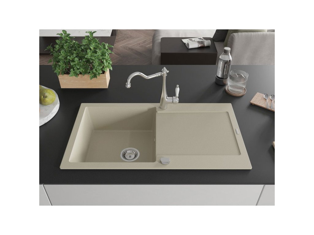 Granitový drez Mexen Leo s 1 misou, odkapávačom a kuchynskou batériou Carla, béžový - 6501-69-670700-00