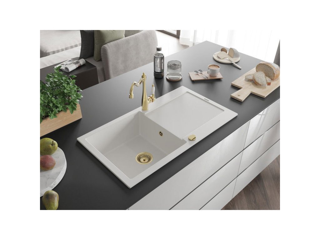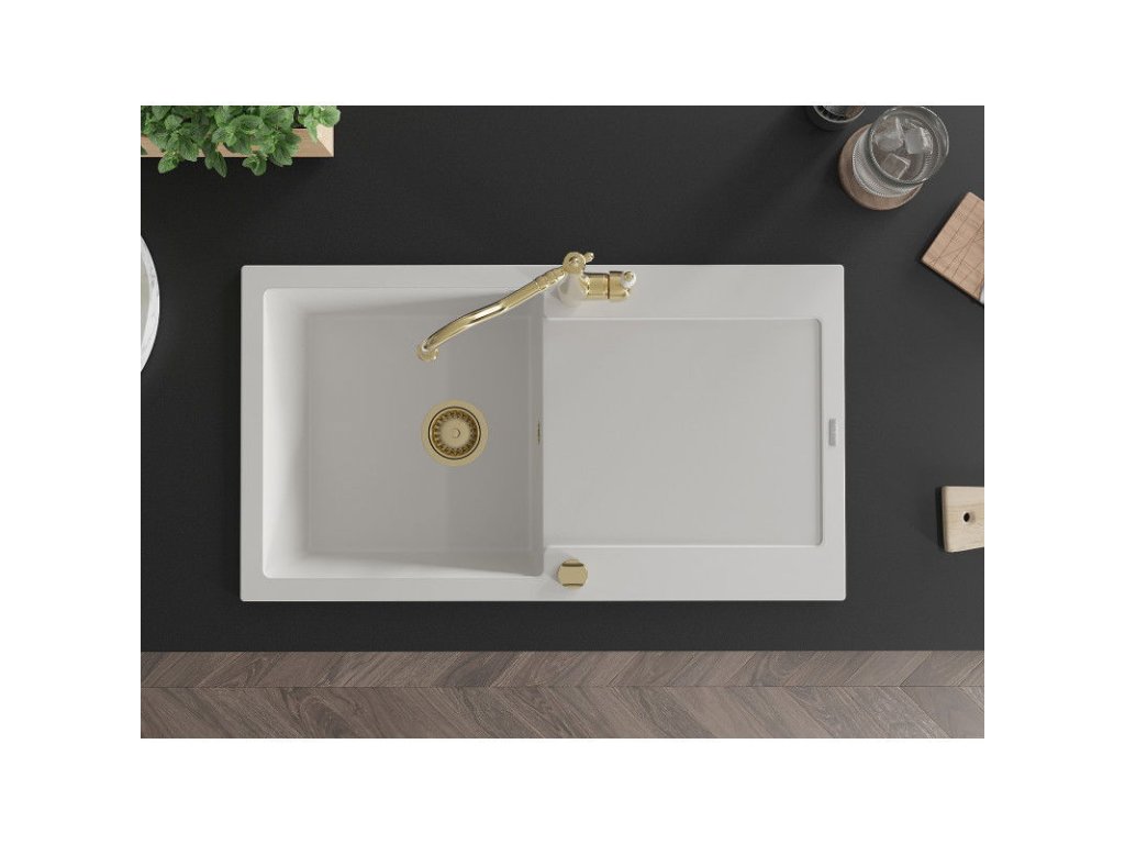 Granitový drez Mexen Leo s 1 misou, odkapávačom a kuchynskou batériou Carla, biely - 6501-20-670700-50