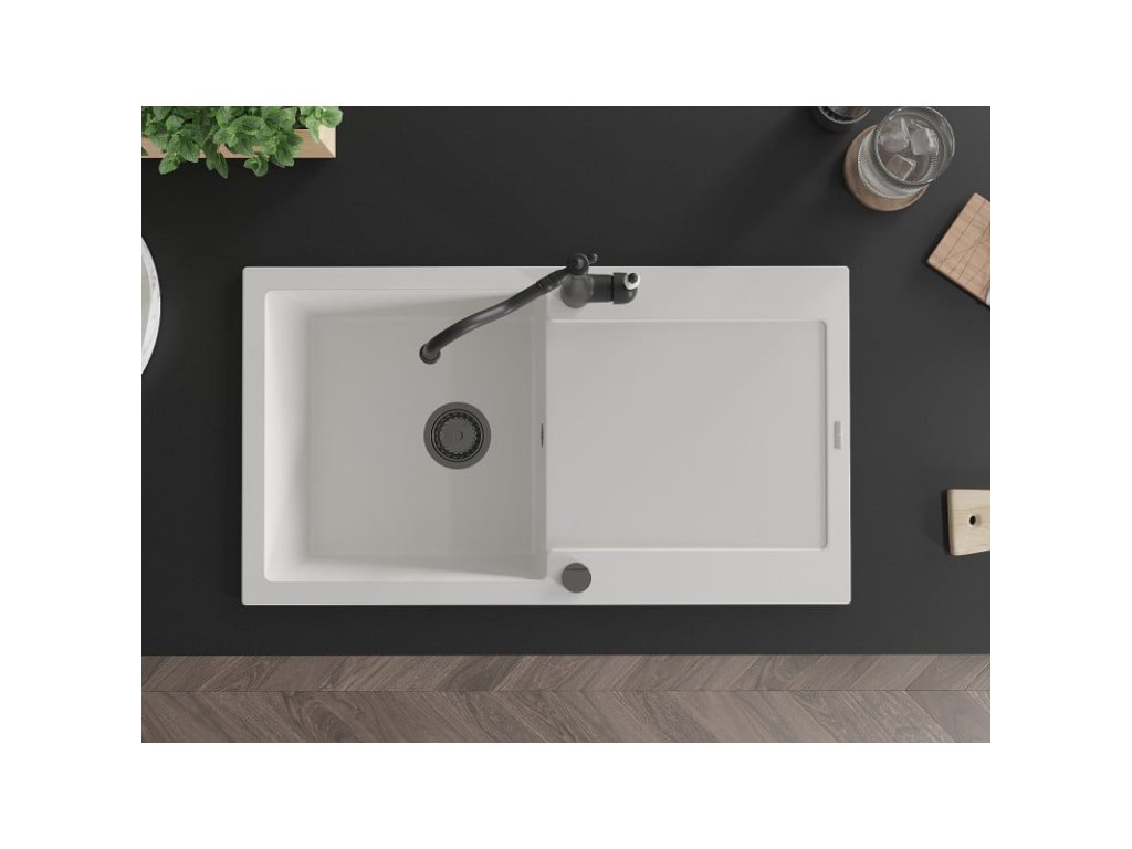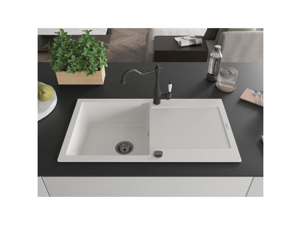 Granitový drez Mexen Leo s 1 misou, odkapávačom a kuchynskou batériou Carla, biely - 6501-20-670700-70