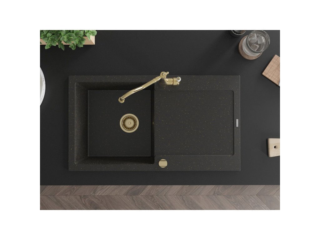 Granitový drez Mexen Leo s 1 misou, odkapávačom a kuchynskou batériou Carla, čierna/zlatá metalíza - 6501-75-670700-50