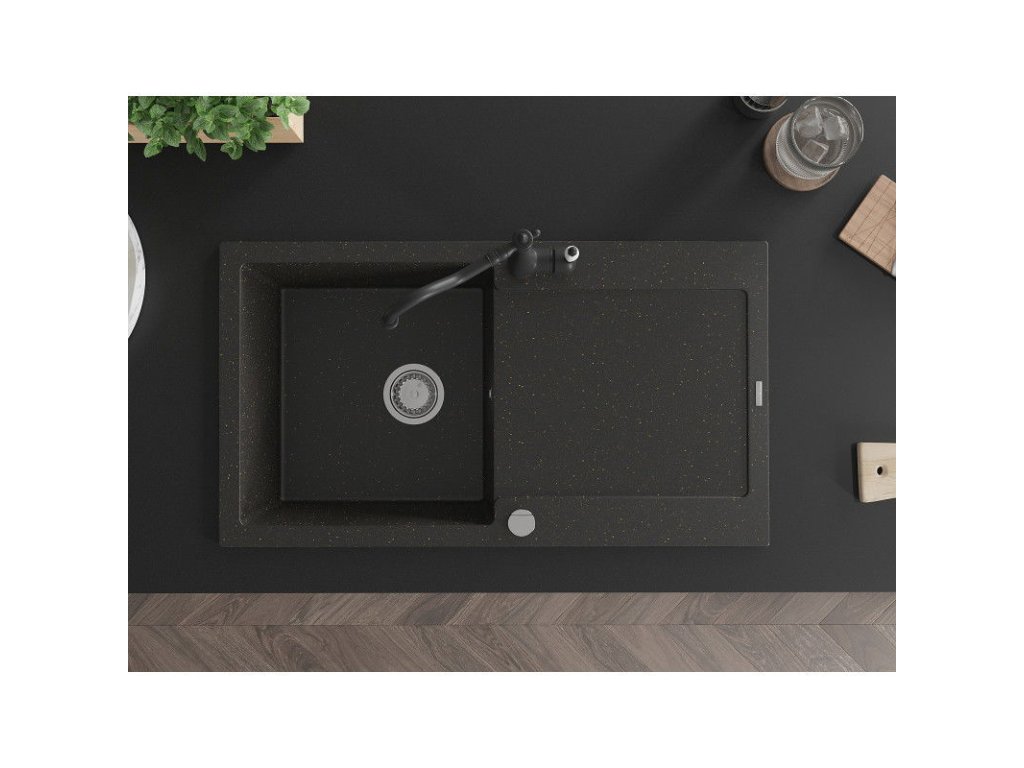 Granitový drez Mexen Leo s 1 misou, odkapávačom a kuchynskou batériou Carla, čierna/zlatá metalíza - 6501-75-670700-70
