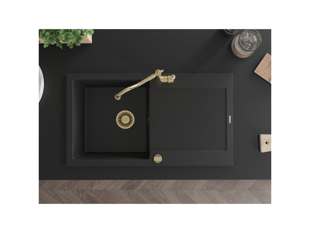 Granitový drez Mexen Leo s 1 misou, odkapávačom a kuchynskou batériou Carla, čierny - 6501-77-670700-50