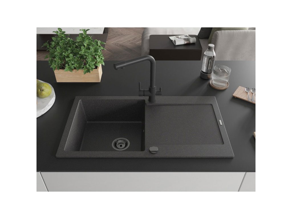 Granitový drez Mexen Leo s 1 misou, odkapávačom a kuchynskou batériou Duero, čierna škvrnitá - 6501-76-671600-70-B