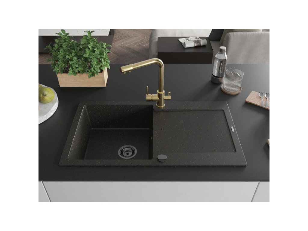 Granitový drez Mexen Leo s 1 misou, odkapávačom a kuchynskou batériou Duero, čierna/zlatá metalíza - 6501-75-671600-50-B