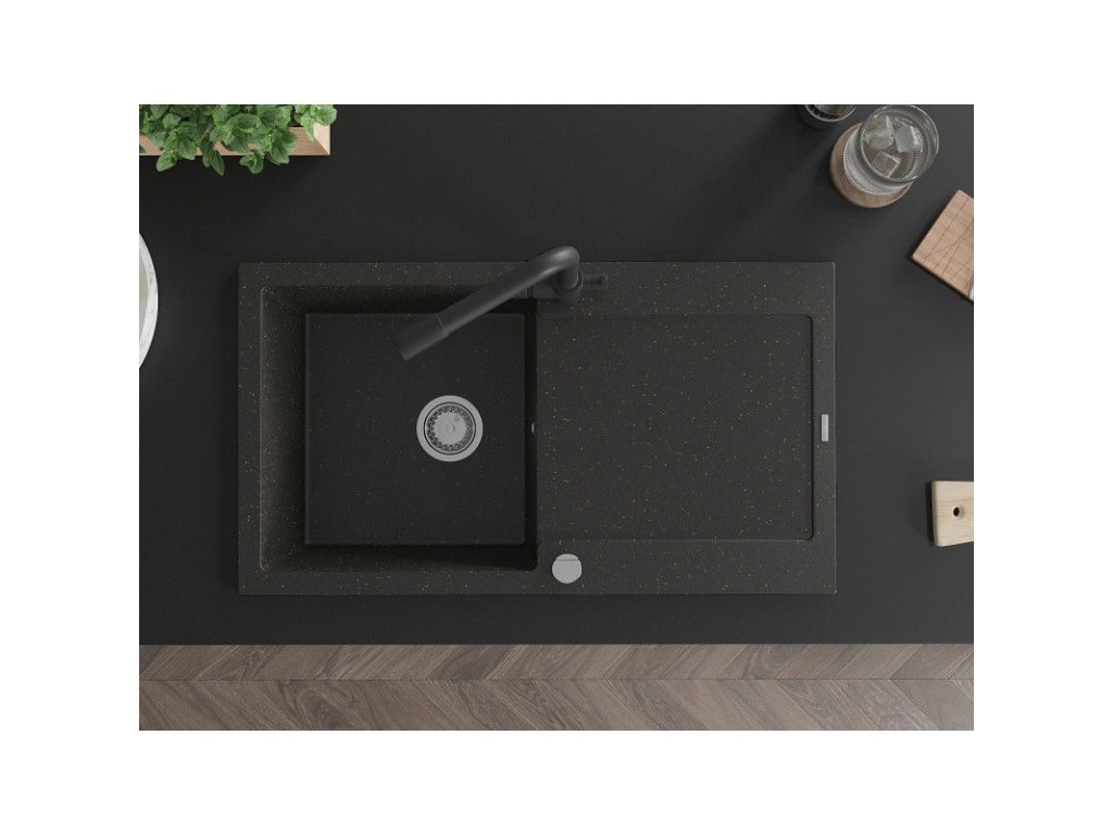 Granitový drez Mexen Leo s 1 misou, odkapávačom a kuchynskou batériou Duero, čierna/zlatá metalíza - 6501-75-671600-70