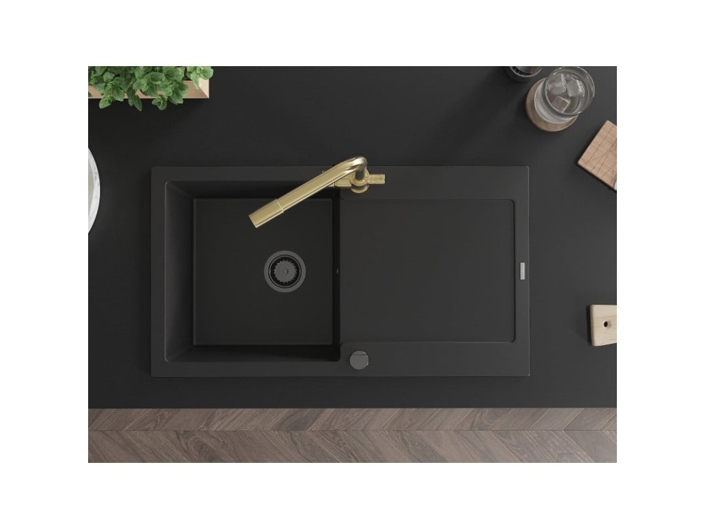 Granitový drez Mexen Leo s 1 misou, odkapávačom a kuchynskou batériou Duero, čierny - 6501-77-671600-50-B