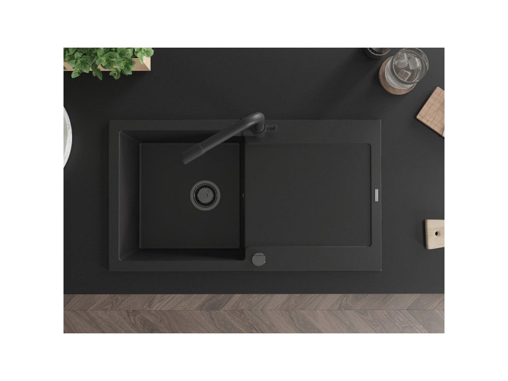 Granitový drez Mexen Leo s 1 misou, odkapávačom a kuchynskou batériou Duero, čierny - 6501-77-671600-70-B