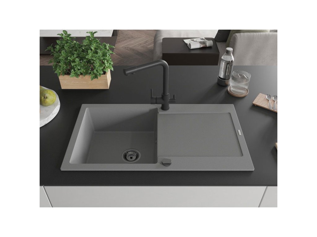 Granitový drez Mexen Leo s 1 misou, odkapávačom a kuchynskou batériou Duero, sivý - 6501-71-671600-70-B