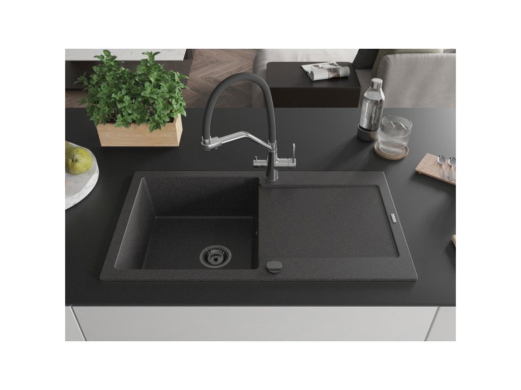 Granitový drez Mexen Leo s 1 misou, odkapávačom a kuchynskou batériou Duo, čierna škvrnitá - 6501-76-671701-07-B