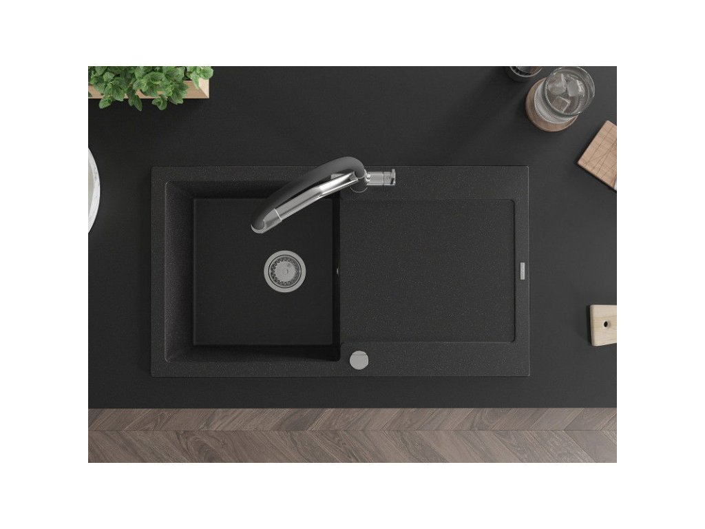 Granitový drez Mexen Leo s 1 misou, odkapávačom a kuchynskou batériou Duo, čierna/strieborná metalíza - 6501-73-671701-07