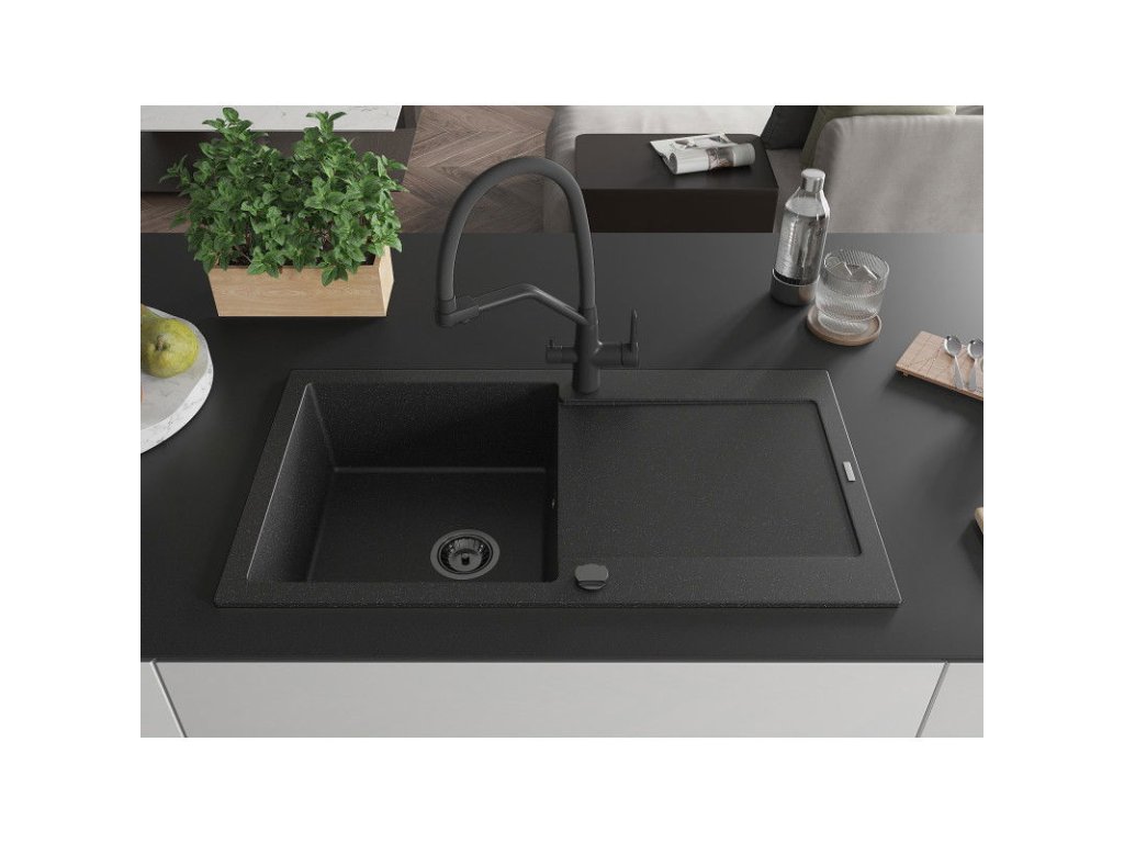 Granitový drez Mexen Leo s 1 misou, odkapávačom a kuchynskou batériou Duo, čierna/strieborná metalíza - 6501-73-671701-70-B