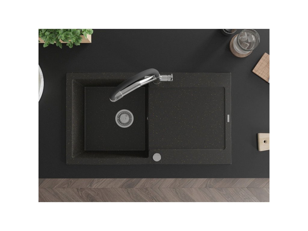 Granitový drez Mexen Leo s 1 misou, odkapávačom a kuchynskou batériou Duo, čierna/zlatá metalíza - 6501-75-671701-07