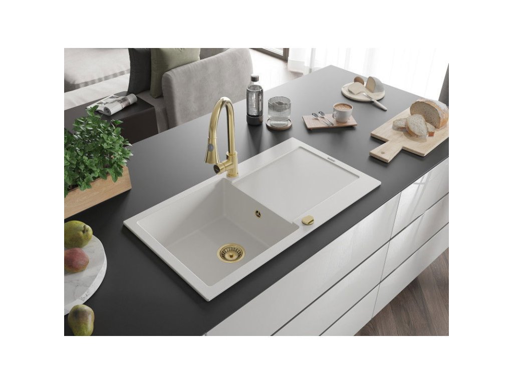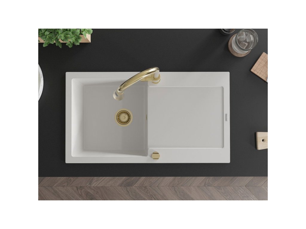 Granitový drez Mexen Leo s 1 misou, odkapávačom a kuchynskou batériou Elia, biely - 6501-20-670101-50